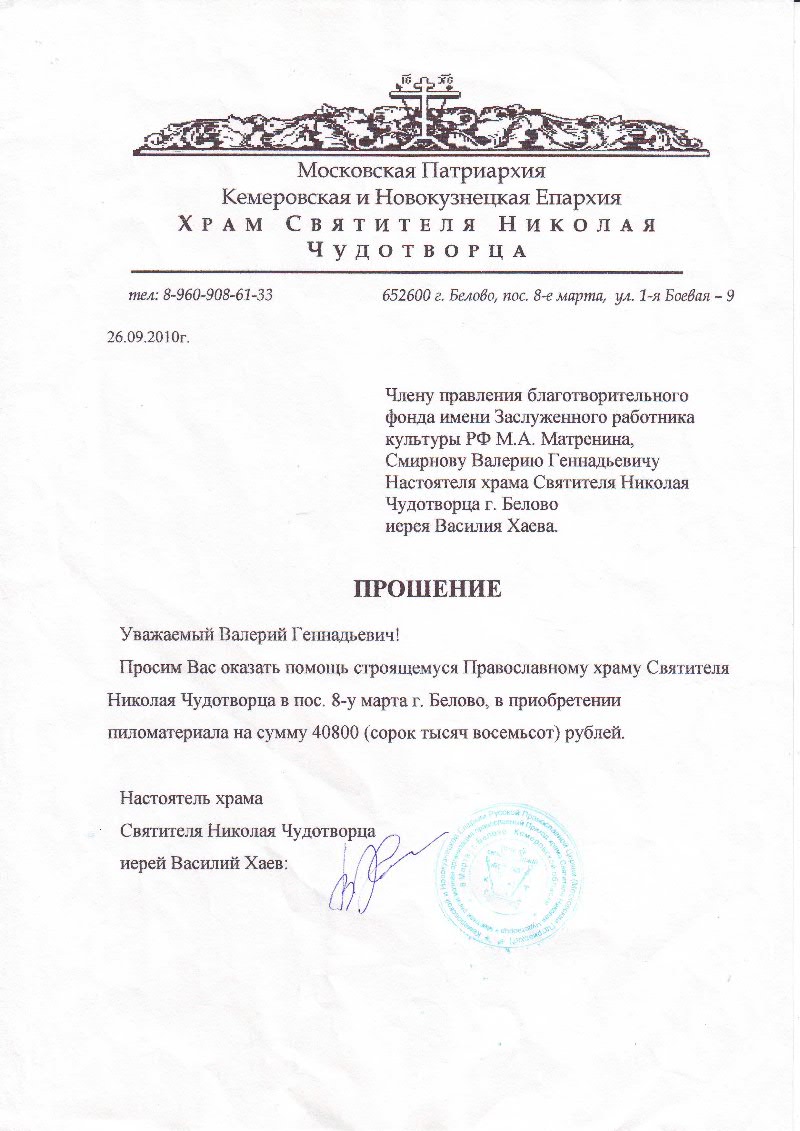 Помощь Храму Николая Чудотворца Наш фонд оказал помощь Храму Николая Чудотворца в г. Белово, перечислив средства в размере 48000 рублей на приобретение пиломатериалов для строительства. Обращение в фонд настоятеля Храма Святителя Николая Чудотворца иерейя Василия Хаева: