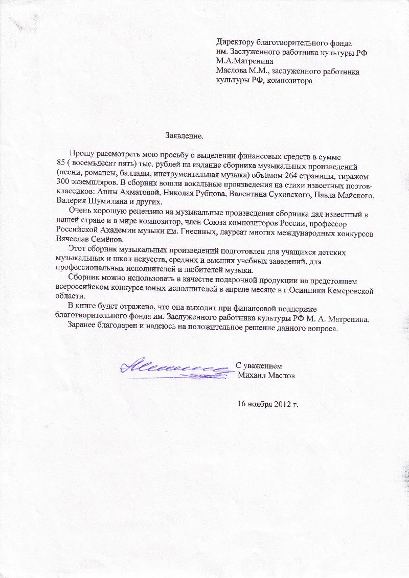 Помощь М. Маслову в издании сборника музыкальных произведений Мы помогли заслуженному работнику культуры РФ,члену Союза композиторов Михаилу Маслову в издании сборника его музыкальных произведений. Обращение в фонд М. Маслова: .