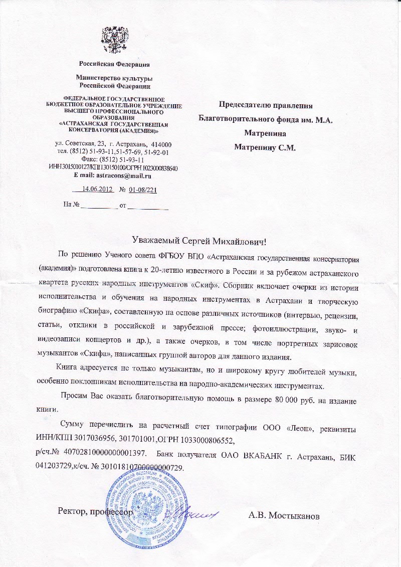 Обращение в фонд ректора ФГБОУ "Астраханская государственная консерватория (академия)" профессора А. В. Мостыканова: